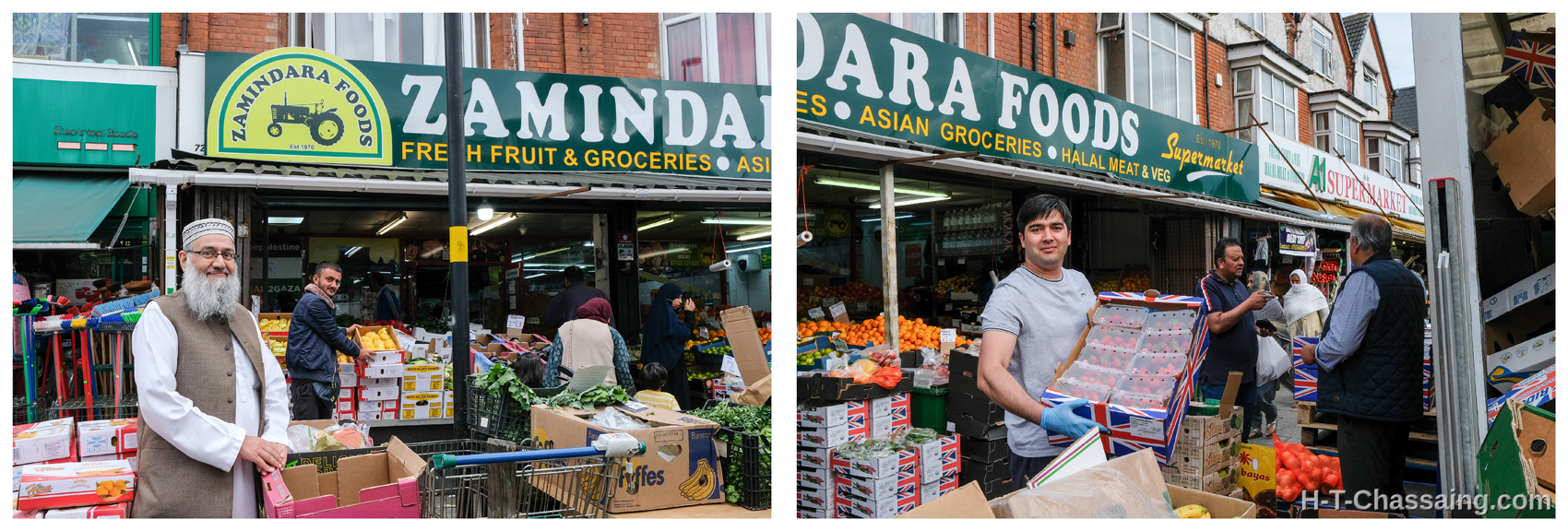 Dans le quartier asiatique, Zamindara Foods Supermarket et ses vendeurs fiers de leur marchandise. Nous repartirons avec de délicieuses grosses mangues jaunes du Pakistan : « King of fruits ! (Le Roi des fruits) », nous annonce le monsieur au premier plan. Stratford Road. Birmingham, Midlands de l’Ouest, Angleterre. Royaume-Uni – 17 Août 2024.