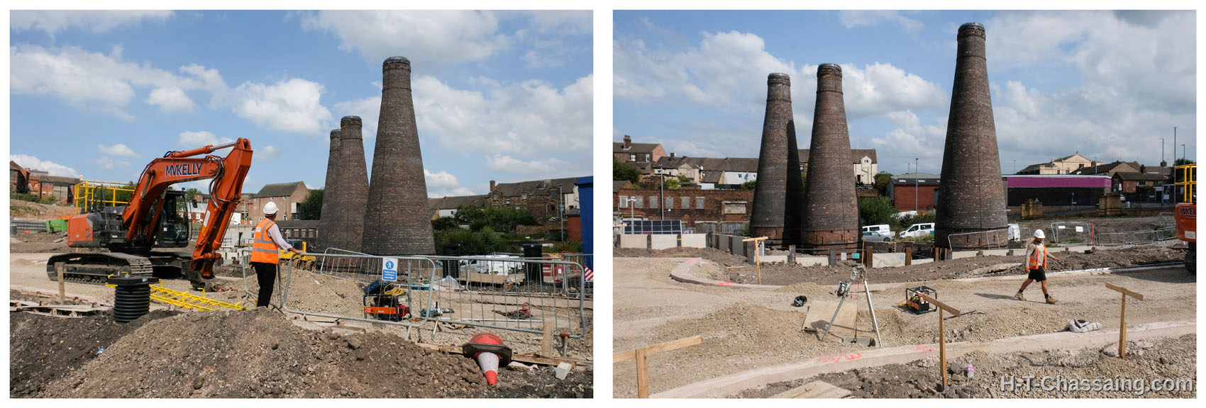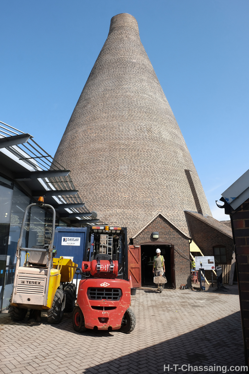 Restauration des 3 sœurs : 3 cheminées (fours bouteille) qui servaient à fabriquer les poteries. Elles seraient les seules cheminées groupées au monde à exister encore et des straps métalliques ont été mis en place pour les maintenir. C’est un chantier d’1 million de livres nous disent les gens sur place. Il y a un projet de construire autour musée, café, cafétéria et 43 maisons pour habiter à Burslem (Stoke-on-Trent). Stoke-on-Trent. Staffordshire, Midlands de l’Ouest, Angleterre. Royaume-Uni – 30 Août 2024.