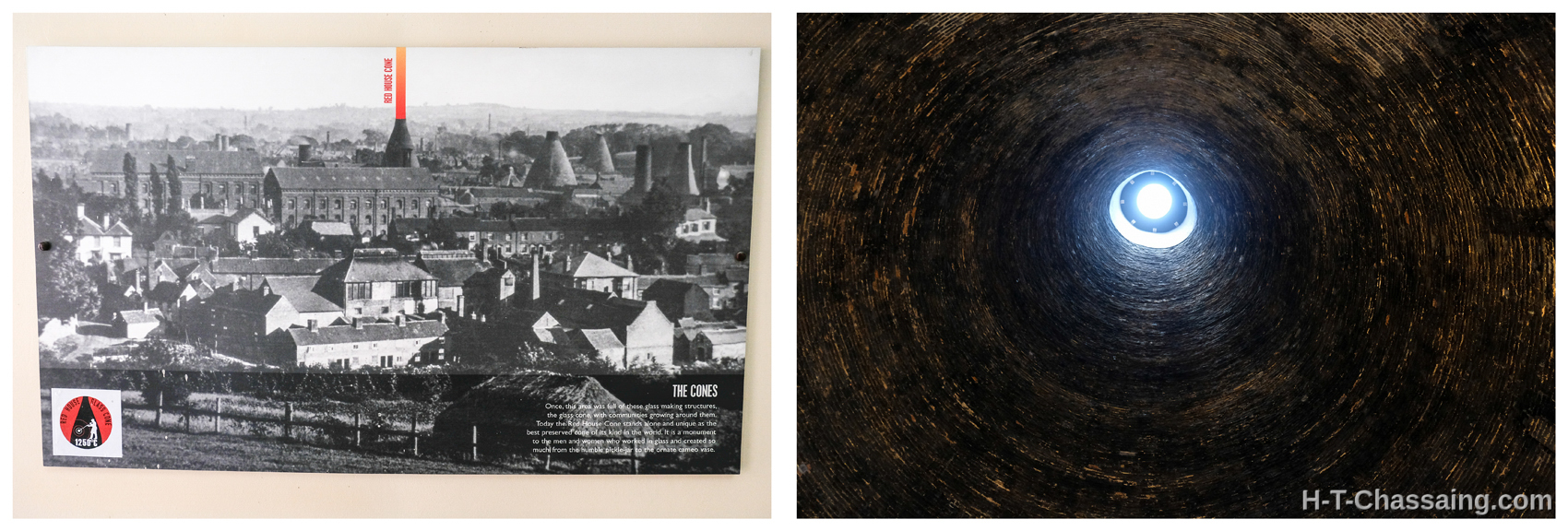 – Vision du haut de la cheminée à l’intérieur du cône. La forme de cône permet de conserver la chaleur. À sa base, alimentée par du charbon il y avait une fournaise au centre, et les gens tout autour qui fondaient le verre.