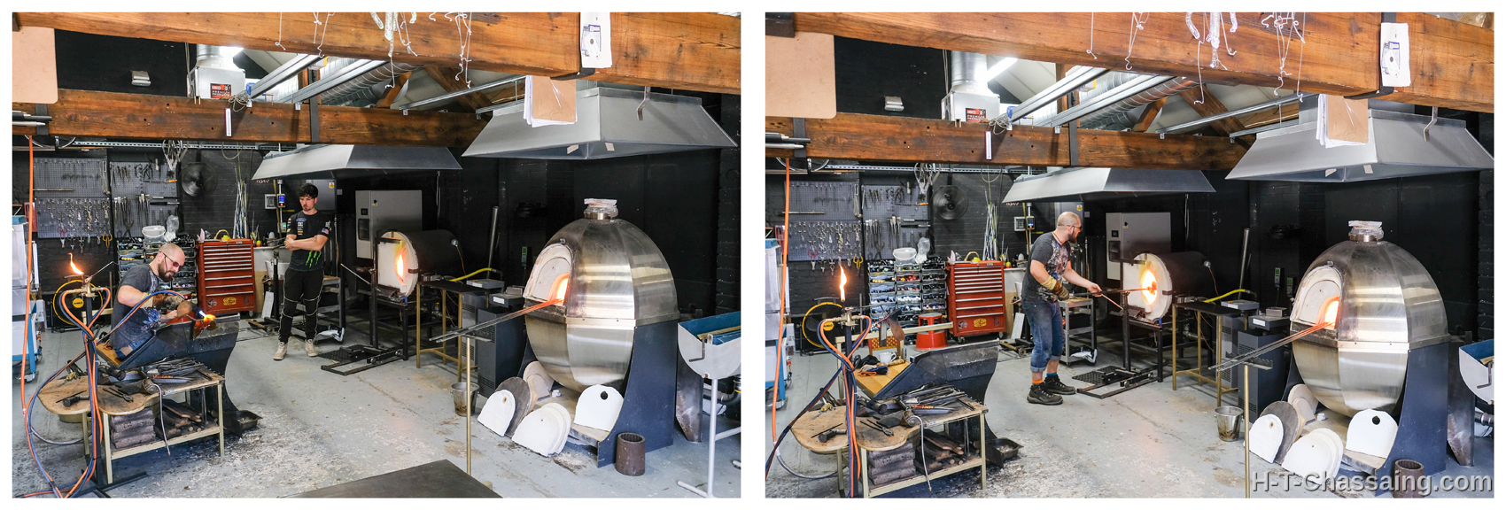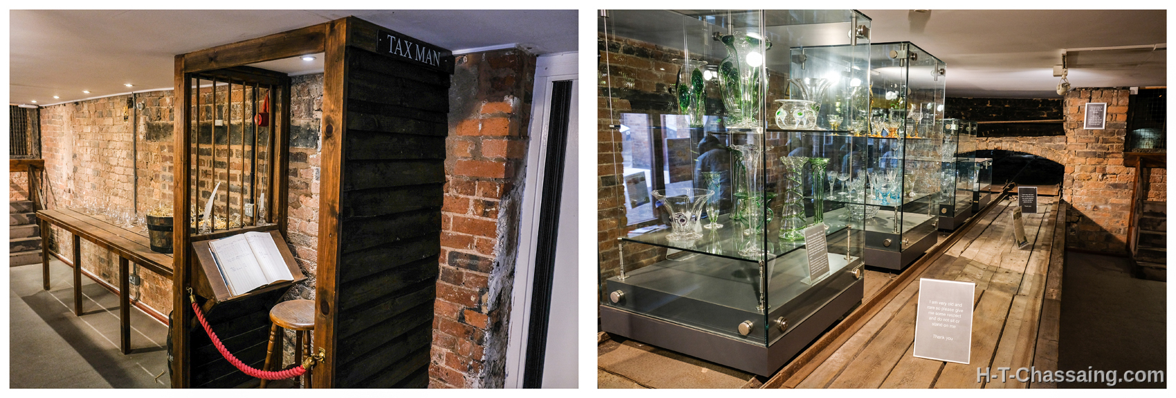 – Exposition des pièces en verre, tout a été fabriqué ici. Dans l’unique lehr du monde, où le verre était laissé à refroidir lentement. Devant les vitrines, (une invention allemande) un système de refroidissement mobile.