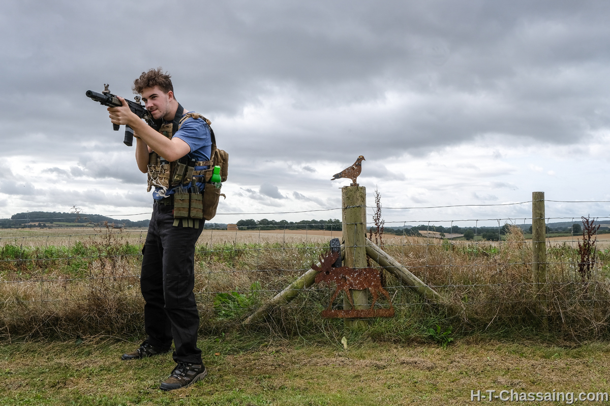 Photo issue de la galerie de nos hôtes. Après nous avoir montré son tir au pistolet sur la cible métallique derrière lui, ce jeune garçon pose avec cette arme de loisir. Angleterre. Royaume-Uni – 2024.