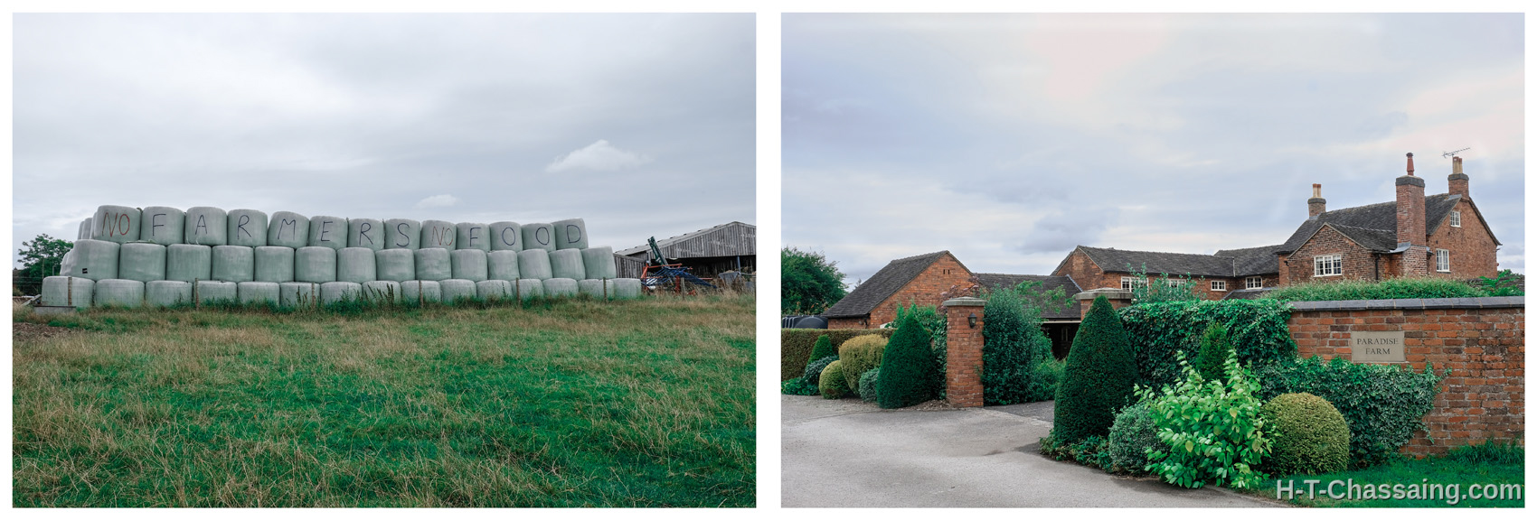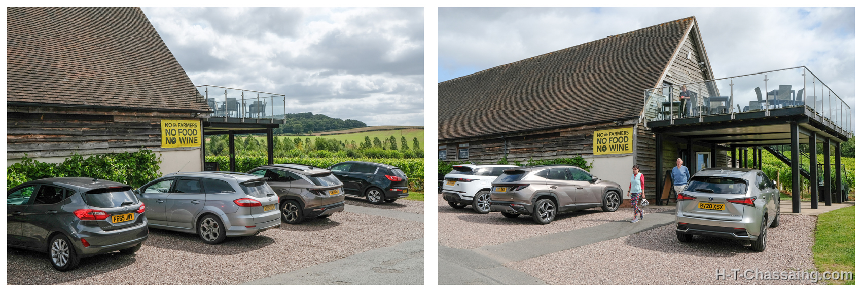 « Pas d’agriculteur, pas de nourriture, pas de vin ». Sur le parking du vignoble Halfpenny Green Wine Estate. Bobbington, Staffordshire, Angleterre. Royaume-Uni – 21 Août 2024.