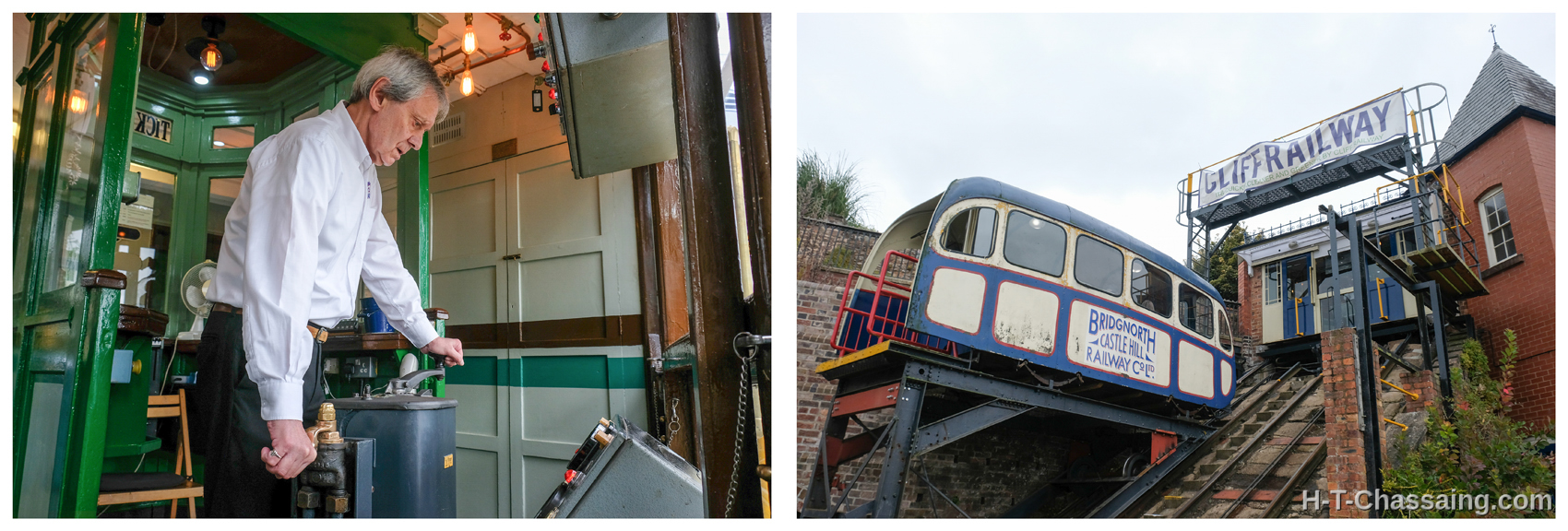Funiculaire de Bridgnorth et son opérateur. Depuis 1892, il relie la ville basse de Bridgnorth, au bord de la rivière Severn, avec la ville haute. Bridgnorth. Shropshire, Midlands de l’Ouest, Angleterre. Royaume-Uni – 21 Août 2024.