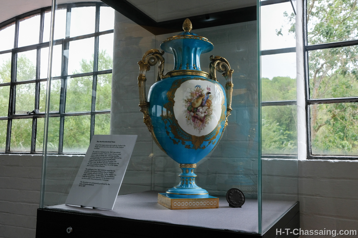 The Northumberland Vase. Sur l’affichette est écrit : « L’une des plus grandes pièces jamais réalisées par Coalport, ce vase inspiré de Sèvres montre les compétences de la force mondiale de Coalport ». Musée Coalport de Porcelaine qui fait partie du complexe muséal de l’Ironbridge Museum. Telford, Shropshire, Angleterre. Royaume-Uni – 22 Août 2024.