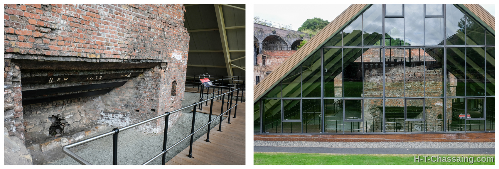 « Le cône de la verrerie de Maison Rouge est l’un des quatre seuls à survivre au Royaume-Uni, et parmi ceux-ci, c’est le mieux conservé. [C’est] en fait une énorme cheminée qui créait un tirage nécessaire pour amener le four aux températures élevées nécessaires pour faire fondre le verre », nous dit ERIH. Ce cône encore en travaux vient tout juste d’être restauré extérieurement (désherbé et réparé avec briques et mortier), il était encore sous échafaudage il y a 2 mois. Musée du Cône de la verrerie de Maison Rouge. Stourbridge. Midlands de l’Ouest, Angleterre. Royaume-Uni – 20 Août 2024.
