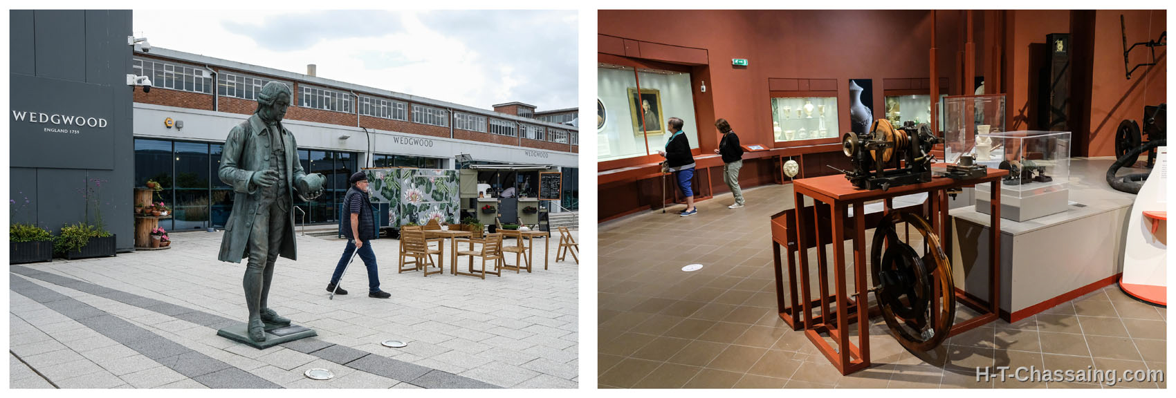 « Edgwood – England 1759 ». Musée de Wedgwood avec la statue de Josiah Wedgwood ou Wedgwood the First et à l’intérieur l’exposition des réalisations en porcelaine.