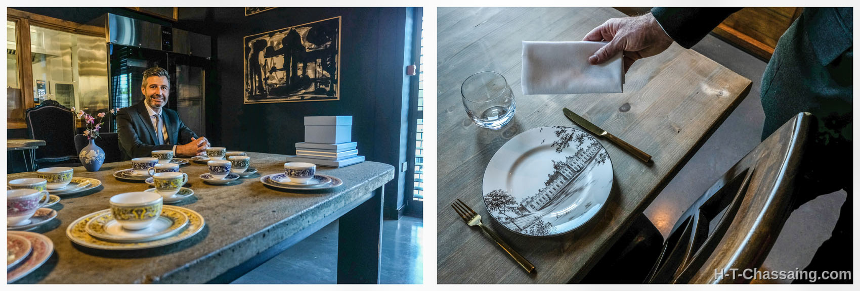 Dans le restaurant Lunar, face au Musée de Wedgwood. Les services de table, porcelaines et couverts viennent de chez Wedgwood. Une première : nous aurons la chance d’être invités à manger par le propriétaire des lieux ! Plus tard, nos hôtes du soir nous confirment que la marque de vaisselle est symbole de luxe. Stoke-on-Trent. Staffordshire, Midlands de l’Ouest, Angleterre. Royaume-Uni – 29 Août 2024.