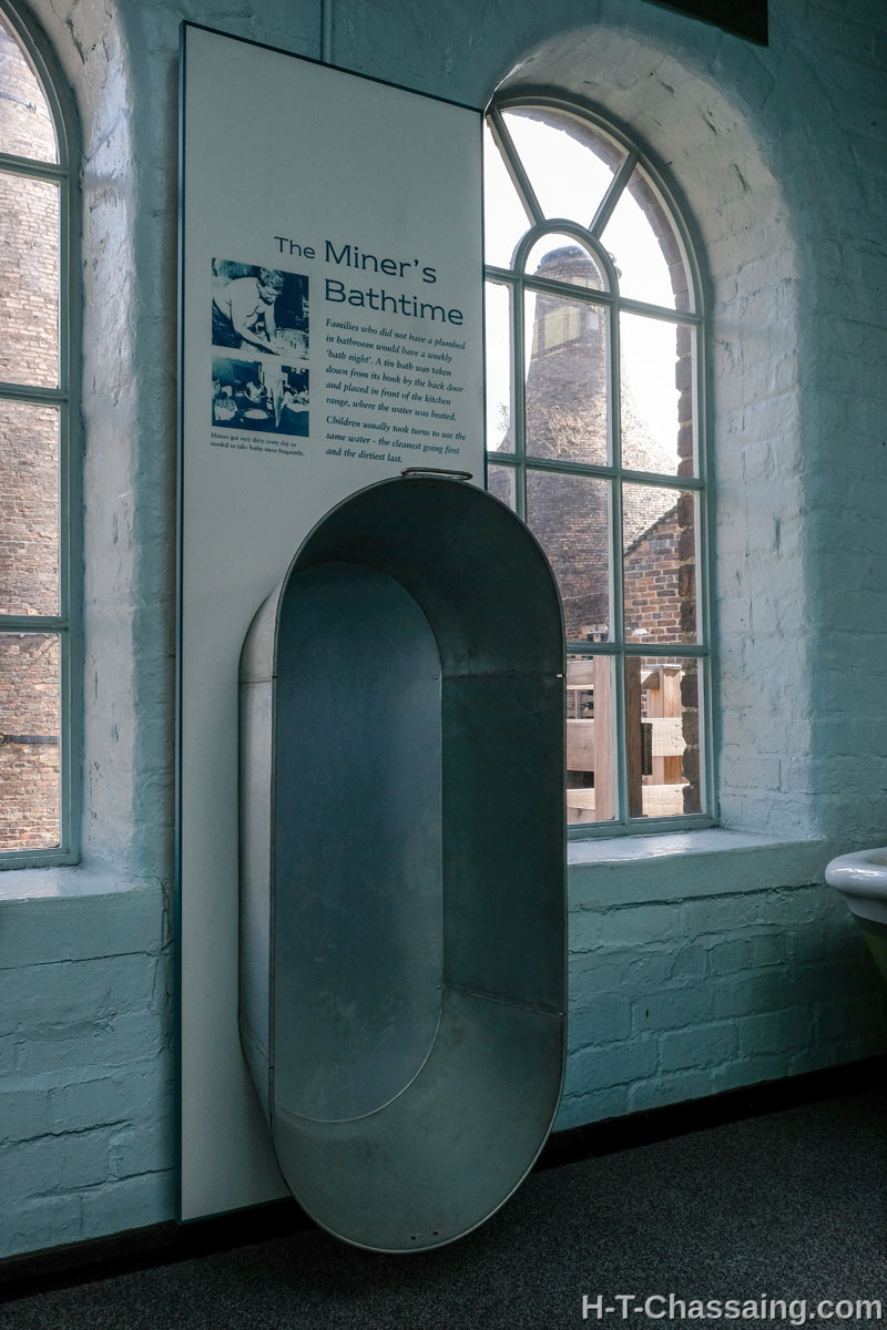 Sur le panneau, il est écrit : « Le temps du bain des mineurs – Les familles qui n’avaient pas de salle de bain avaient une “soirée bain” hebdomadaire. On décrochait une baignoire en tôle de son crochet près de la porte de derrière et on la plaçait devant la cuisinière, où l’eau était chauffée.