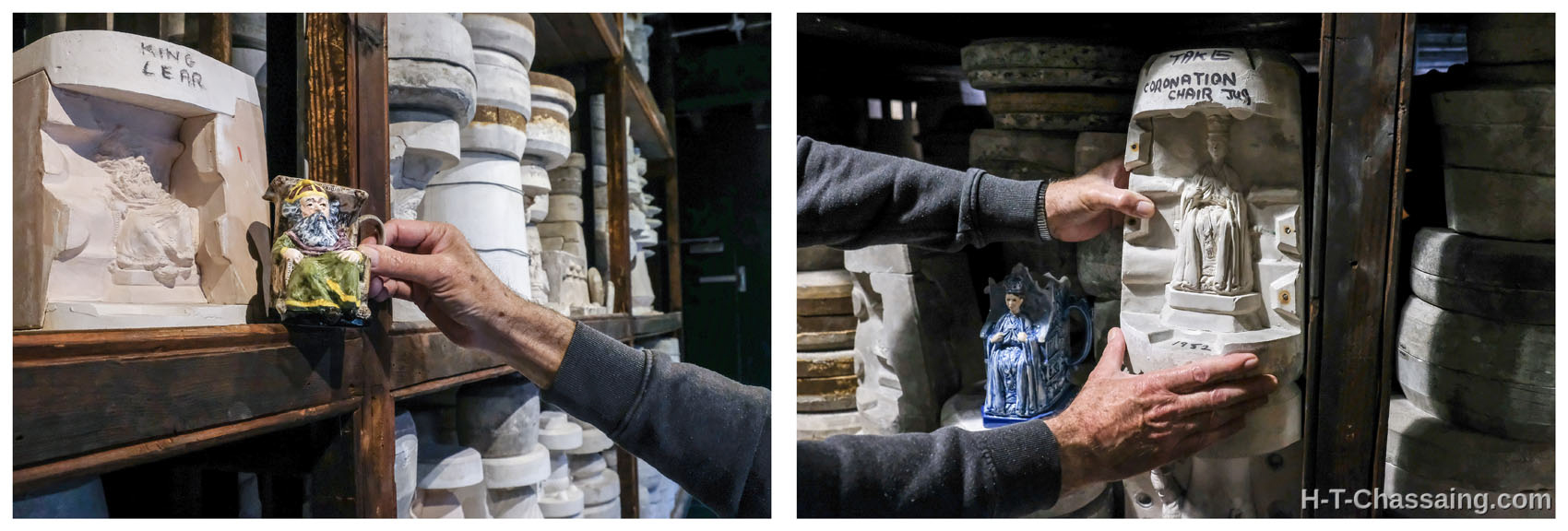Moule puis poterie finie du Roi Lear et poterie finale et moule du Couronnement de la Reine datant de 1952. « Prenez la chaise de couronnement Jug ». La cuisson des poteries est un processus très délicat, il y a environ 60% de déchets lorsqu’on fait les cuire, dus aux pièces qui cassent ou se fendent. Middleport Pottery. Stoke-on-Trent. Staffordshire, Midlands de l’Ouest, Angleterre. Royaume-Uni – 30 Août 2024.
