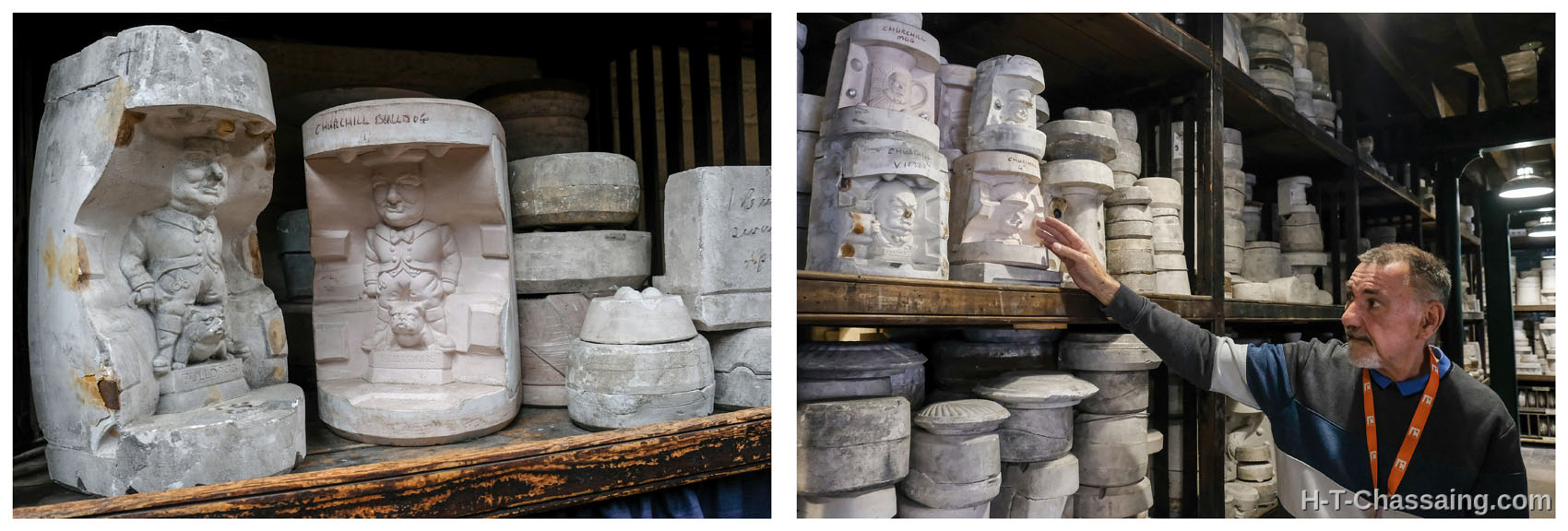 « Churchill bulldog ». 20 000 moules historiques sont préservés dans ce musée. Ici des figurines de Winston Churchill avec un bulldog. Middleport est la seule place dans le monde où nous réalisons un transfert de tissu sur la poterie et où on peut se marier dans le four bouteille. Middleport Pottery. Stoke-on-Trent. Staffordshire, Midlands de l’Ouest, Angleterre. Royaume-Uni – 30 Août 2024.