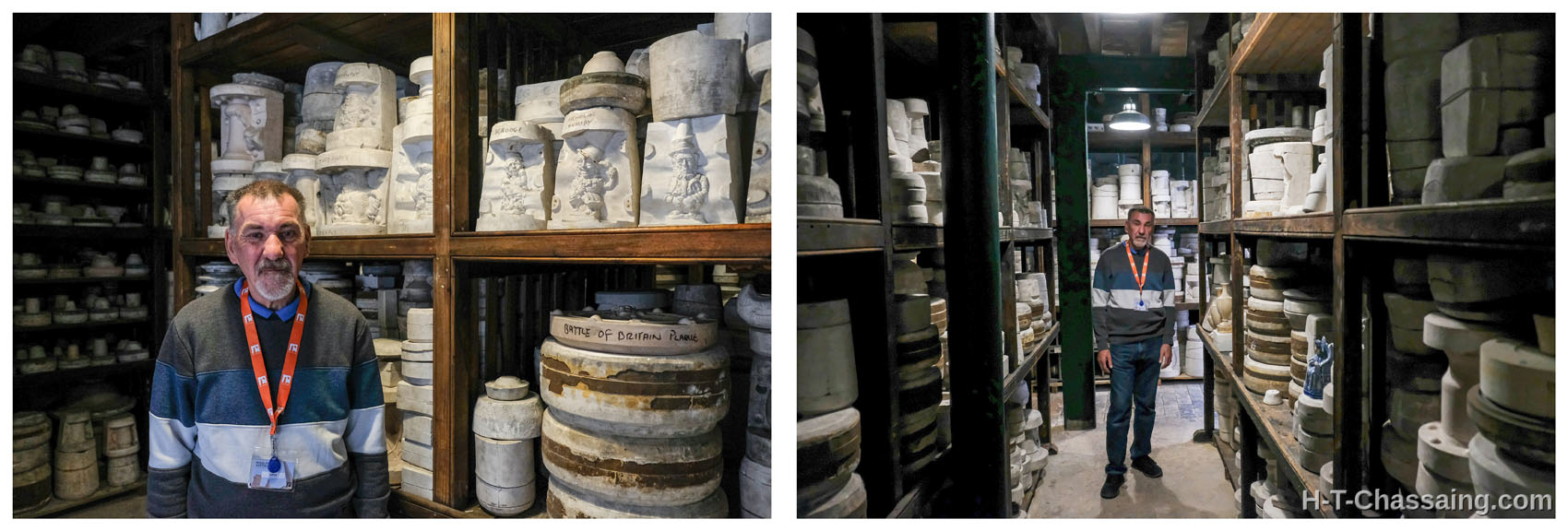 « Plaque de la bataille d’Angleterre » sur le moule. Notre guide qui fait partie des volontaires de l’usine de Poterie de Middleport. Stoke-on-Trent. Staffordshire, Midlands de l’Ouest, Angleterre. Royaume-Uni – 30 Août 2024.