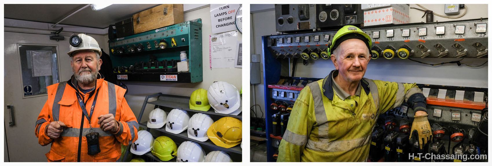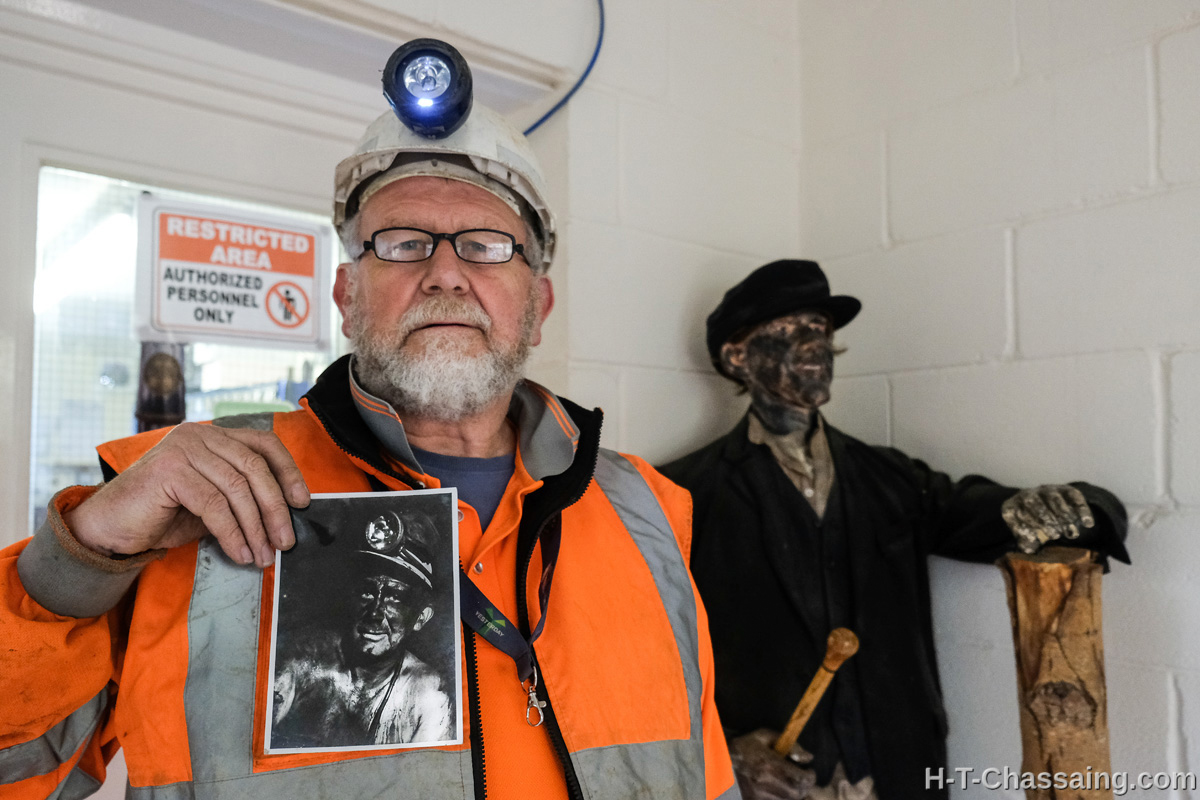 Devant le mannequin de mineur, Roger notre guide avec une photo de lui. « Black face », gueule noire en 1994, 4 ans avant qu’il arrête le travail dans la mine. Roger a commencé à travailler à 13 ans, à 15, il a eu une lampe et est descendu sous terre, puis il a fait une formation de 4 ans.