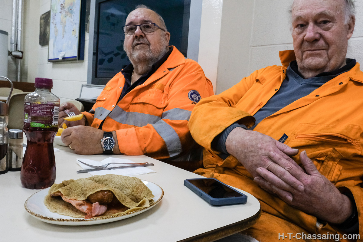 À la cafétéria de la mine où maintenant les visiteurs aussi peuvent se restaurer, la spécialité de Staffordshire : the oatcake. Cela ressemble à une galette bretonne, c’est une crêpe à l’avoine complètes avec à l’intérieur un œuf, de la viande ou bien du bacon, des champignons et du fromage fondu (nous avons plusieurs versions). On nous explique que c’est le genre de casse-croûte que les mineurs descendaient dans la mine. Ils le mettaient dans la « food box », une boîte métallique pour protéger la nourriture des rats. Apedale Colliery. Staffordshire, Angleterre. Royaume-Uni – 31 Août 2024.